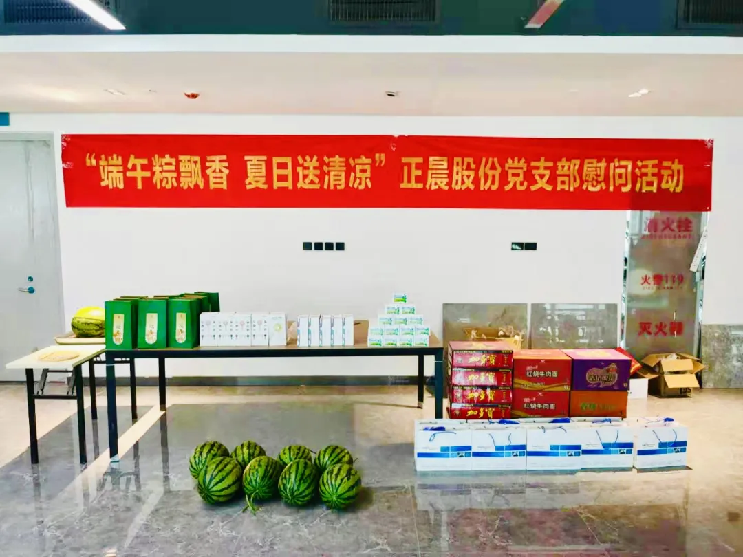 活动现场,正晨股份党支部党员代表们为现场工作人员送上了端午粽子、西瓜、凉茶、藿香正气水、方便面、洗漱大礼包等防暑降温慰问品,并向大家送去节日的问候和祝福。